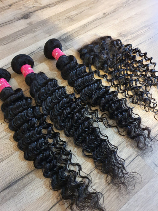 Set 3 Bundles + 4x4 Closure Human Hair 10"-40" (25cm-100cm) Deep Wave