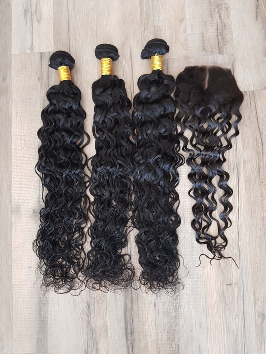 Set 3 Bundles + 4x4 Closure Human Hair 10"-40" (25cm-100cm) Natural Wave (Water Wave)