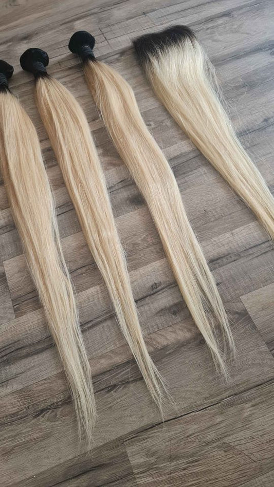 Set 3 Bundles + 4x4 Closure Human Hair 10"-30" (25cm-75cm) Straight Color 1b/613
